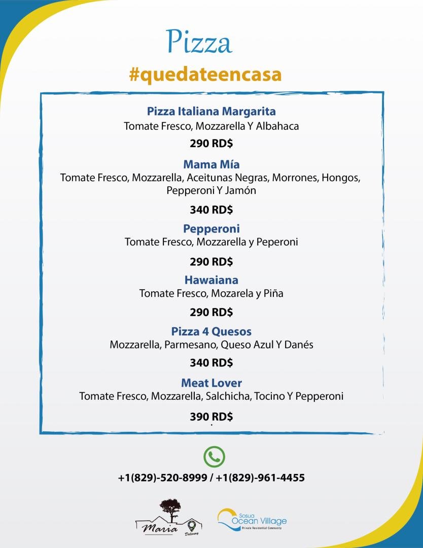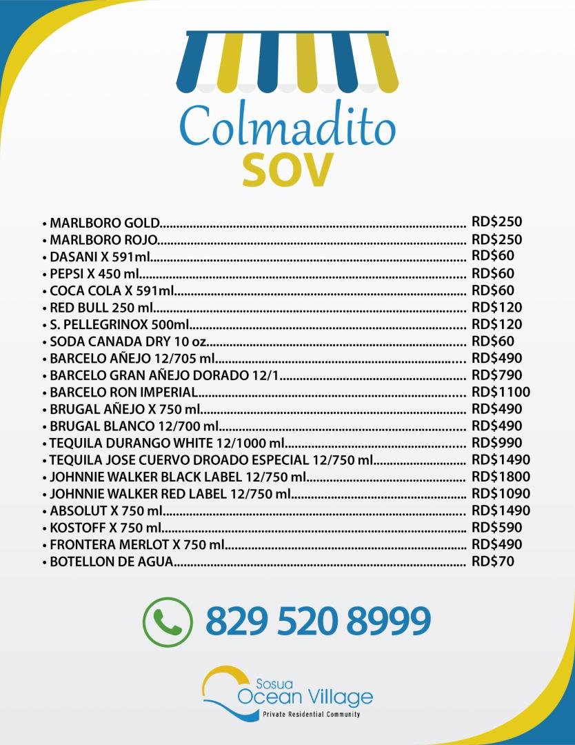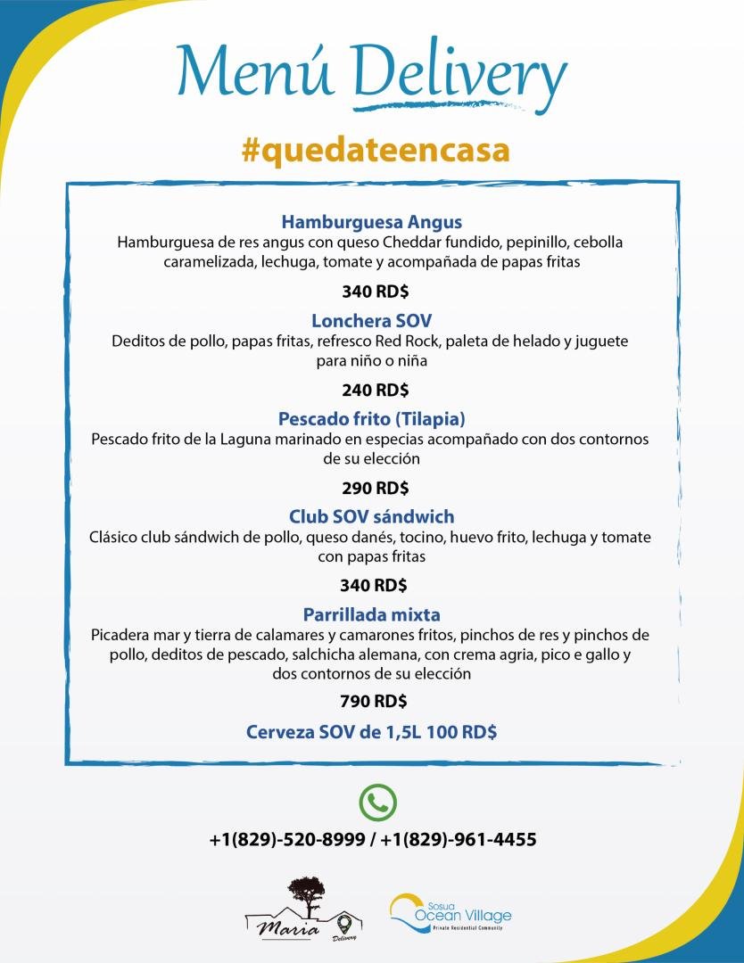 Favor tener en cuenta que la entrega a domicilio está disponible solo en el área residencial de Sosua Ocean Village, Ocean Village Deluxe, Las Palmas.
