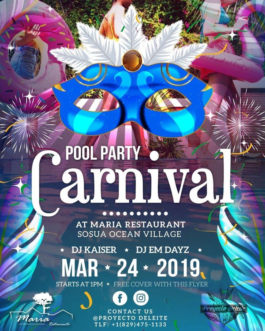 Приглашаем вас на праздник у бассейна инфинити в ресторане "Мария" в следующее воскресенье 24 марта. Погрузитесь в атмосферу карнавала под сеты диджеев из Венесуэлы и Доминиканы и обязательно попробуйте изысканные авторские коктейли от лучшего бармена Сосуа. Начало в 13.00. Вход бесплатный. Звоните: 829-961-4455.